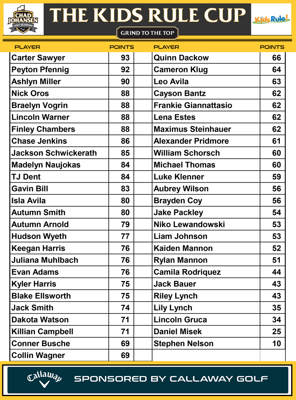 Kids Rule Cup Leaderboard as of 7/10/2025