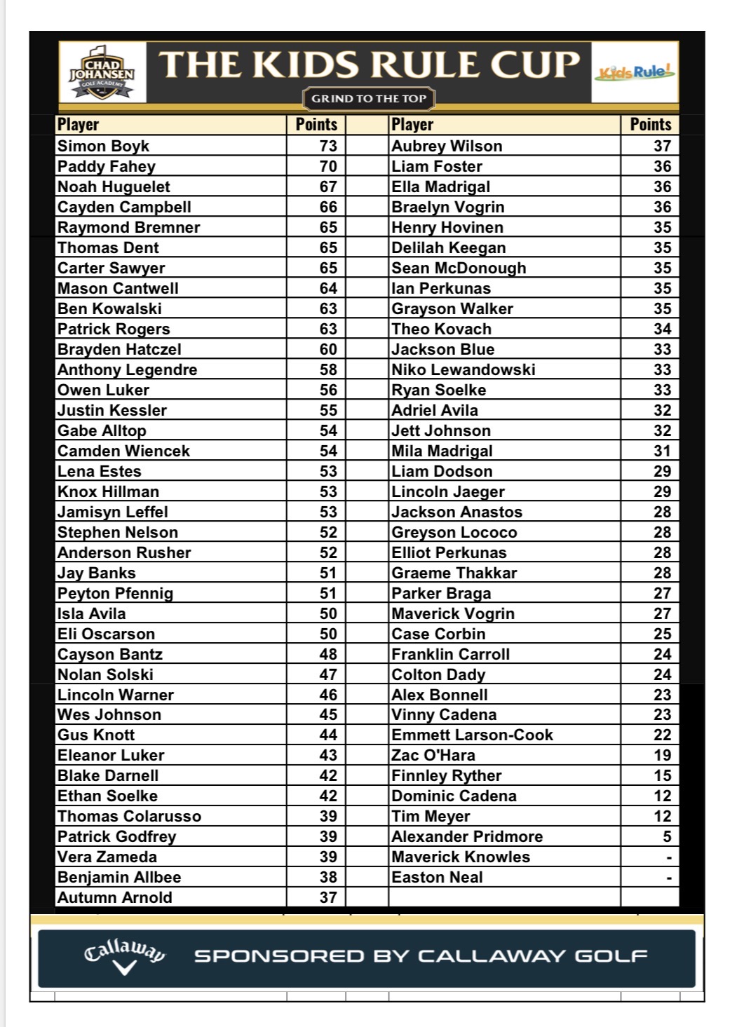 THE KIDS RULE WINTER CUP LEADERBOARD