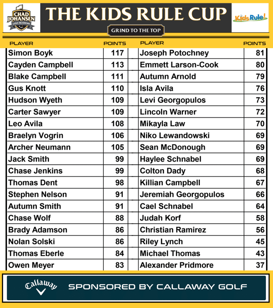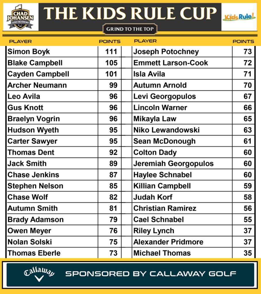 The Kids Rule Cup points system consists of many different skills challenges in practice and other ways to earn points in matches. The points system is sponsored by Callaway Golf with many prizes awarded on the last day of the program. The 2025 champion will get their name engraved on the Kids Rule Cup.
