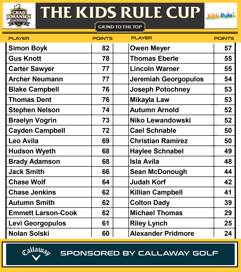 Kids Rule Cup Leaderboard as of 9/22/2025