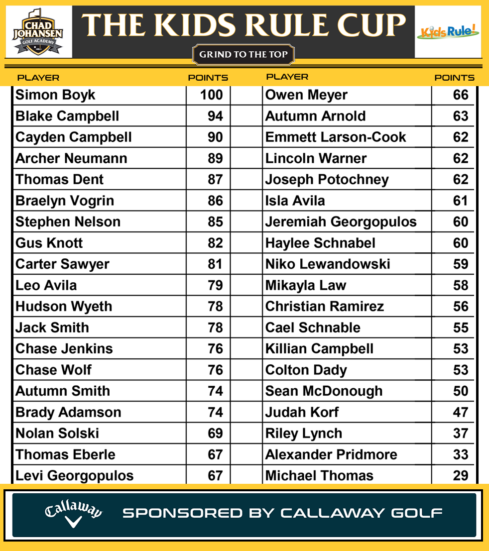 Kids Rule Cup Leaderboard as of 9/25/2025