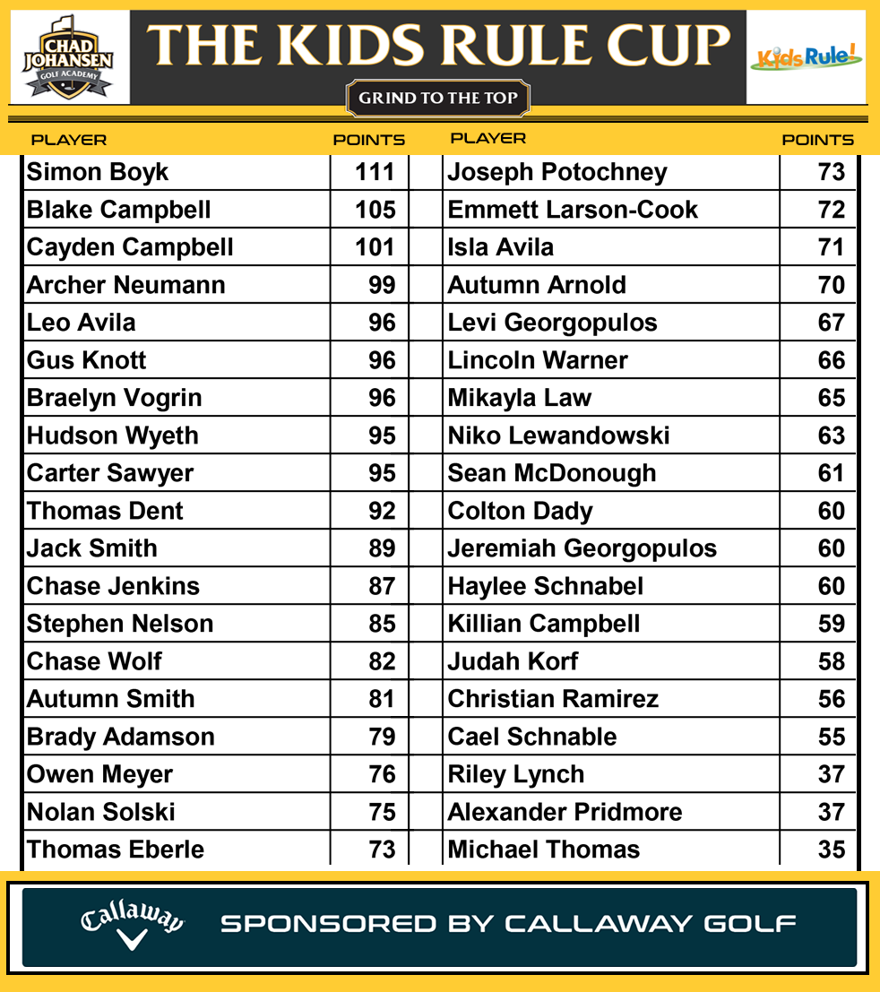 Kids Rule Cup Leaderboard as of 10/08/2025